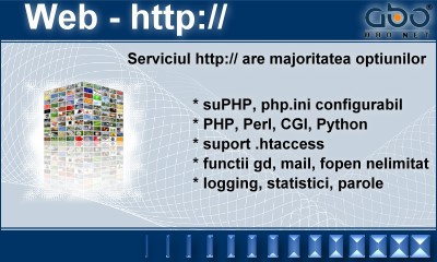 Avand inclus suPHP, nu aveti nevoie sa setati permisiuni pentru scripturile dvs. De asemenea php.ini este configurabil, daca aveti nevoie de o optiune, sau doriti sa blocati alta, aveti control complet. Versiunile de PHP in general sunt ultimele stabile. Aveti de asemenea majoritatea optiunilor pe care le gasiti la orice provider, de la alias-uri, symlinks, redirectari, .htaccess pana la sistem avansat de logging (pe care rar il puteti gasi undeva). Functiile in PHP le puteti folosi fara probleme, nu exista limite decat ale bunului simt, nu mai aveti astfel probleme cu scripturile care au nevoie de optiuni sau setari personalizate.